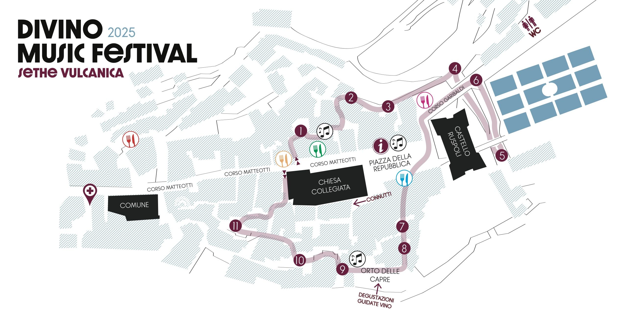 Un’occasione rara per conoscere e assaporare le espressioni più autentiche di territori scolpiti dal fuoco e dal tempo, in un contesto unico per atmosfera e accoglienza. Non solo degustazioni, ma anche concerti live, food, visite guidate del Castello Ruspoli e dei Connutti. Ma anche incontri tematici per chi vuole approfondire, chiacchierare, ascoltare e lasciarsi sorprendere. Il Divino Music Festival è pensato per chi ama il vino e scoprire luoghi nuovi, per chi cerca emozioni semplici ma autentiche. Due serate speciali, da vivere sorso dopo sorso. Vieni a scoprirle a Vignanello.